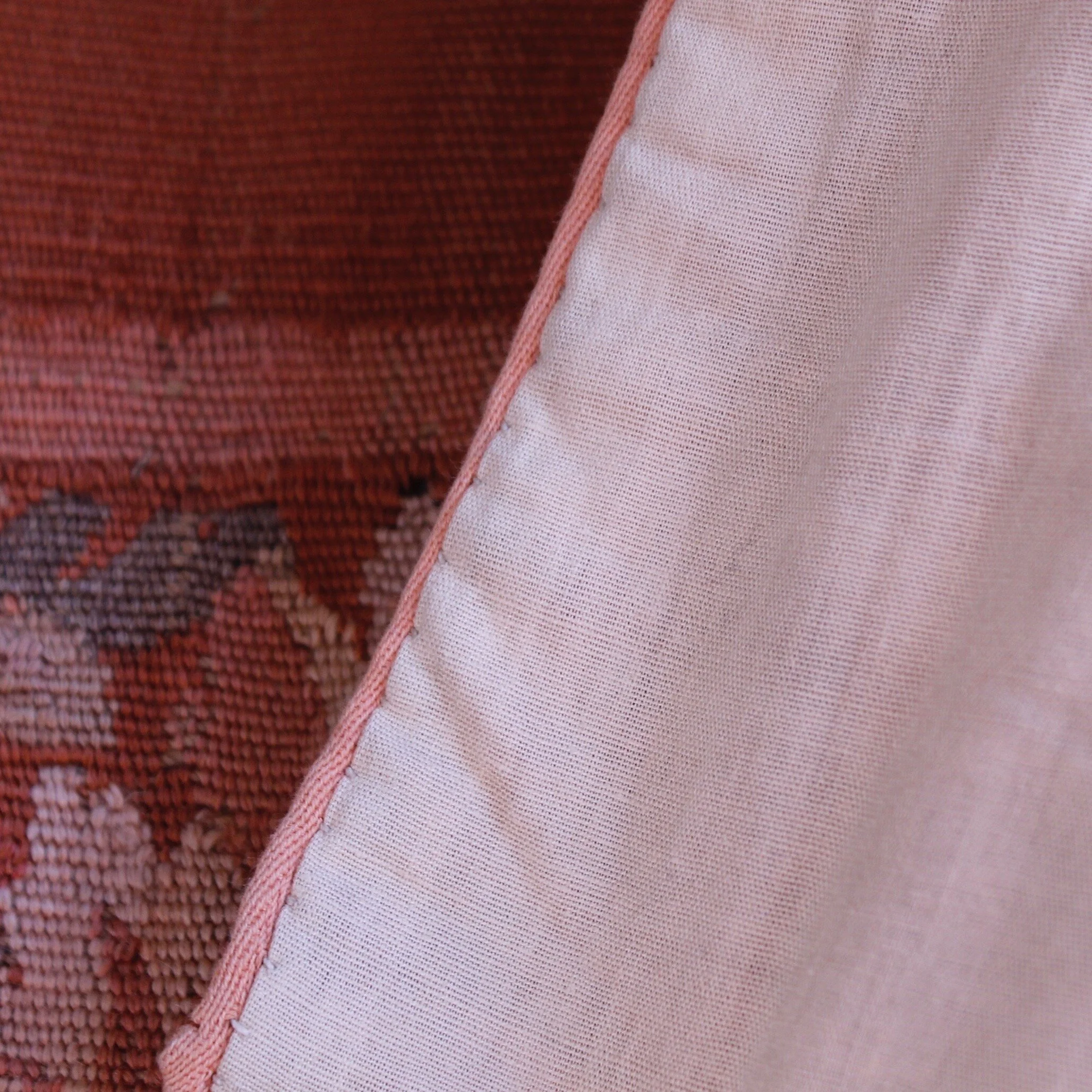 A fine wool tapestry featuring a pair of pheasants standing in a verdure pattern of oversized foliage and vague landscape elements, executed in an unusually warm palette of salmon, cream, pinks and shades of green. The foliate and floral border is woven of a piece with the tapestry, with a hand stitched border of light salmon cotton on the outermost edge. Hand stitched muslin backing added later. A stitched pocket holds a hanging rod along the top. Can be hung with any drapery brackets. Mid 19th century. Very good antique condition - typical irregularities to the weave here and there. Hanging rod measures approx. 52.”