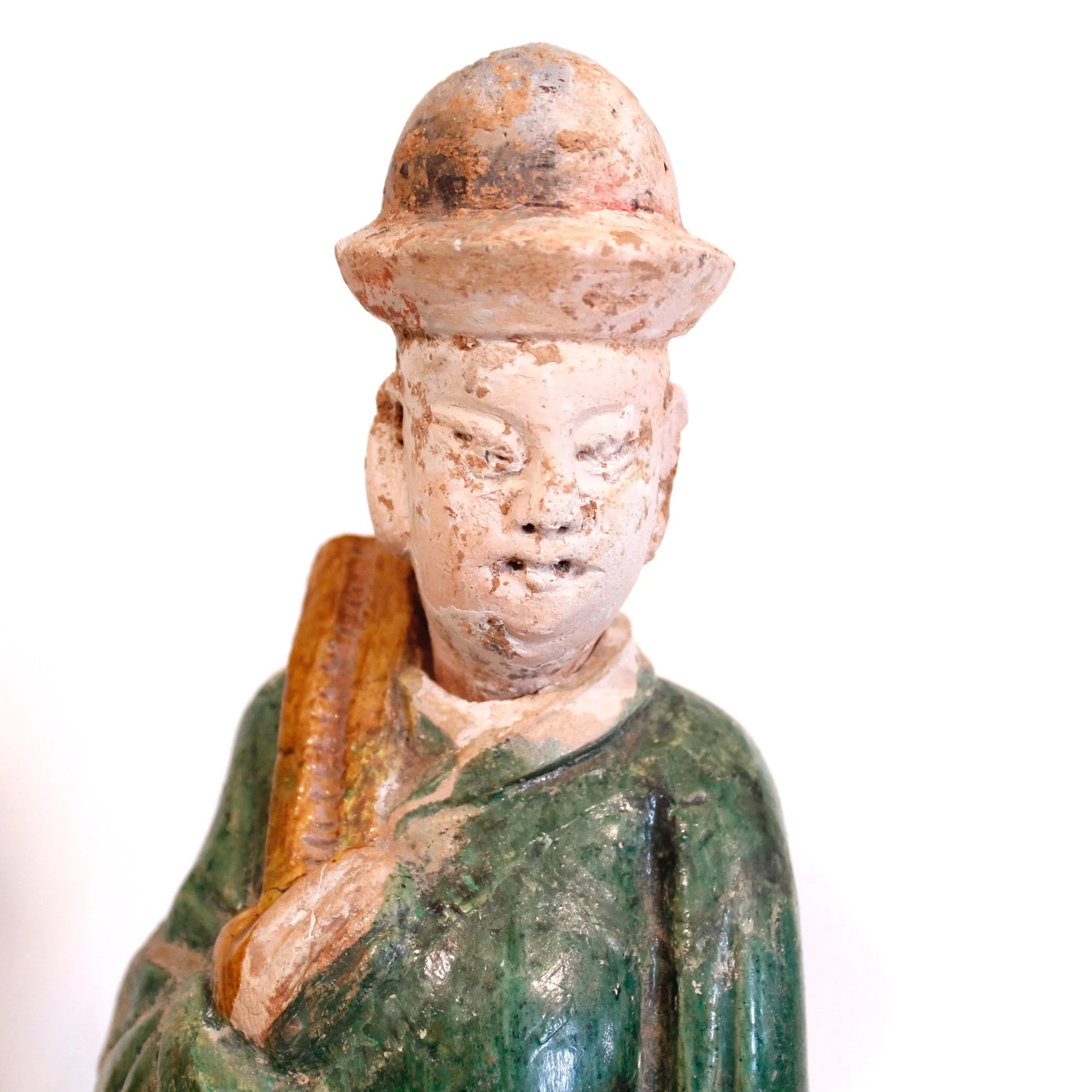 A charming pair of Sancai glazed terra cotta attendant figures standing on pedestals. The faces are finely modeled, each wearing a distinctive hat. Figures such as these were benevolent presences, who watched over the tombs of the well-to-do. 18th century or earlier. Good antique condition with attractive distressed surfaces, heavy wear in places, chips and losses along with many irregularities, as made. Heads are tight on the necks - possibly glued- often the heads are removable in figures of this type.